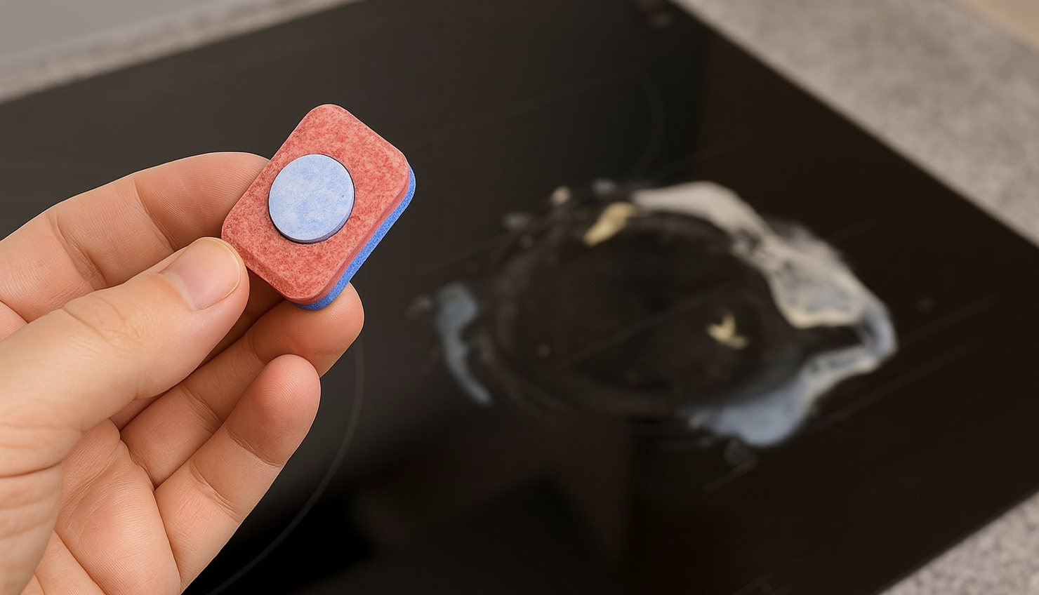 Many people scrape, scrub or use harsh chemicals on their stove, hoping to remove burnt-on spots quickly. Unfortunately, this can damage the surface, spread the dirt around or simply not work at all. Even strong cleaners often fail to soften the hardened crust that forms when something boils over. A dishwasher tablet works differently. Instead of using aggressive chemicals, it releases enzymes, degreasers and cleaning agents slowly, allowing them to break down the residue without scrubbing. But this only works if you dissolve the tablet first. Rubbing it directly on the stove does very little and can scratch the surface.