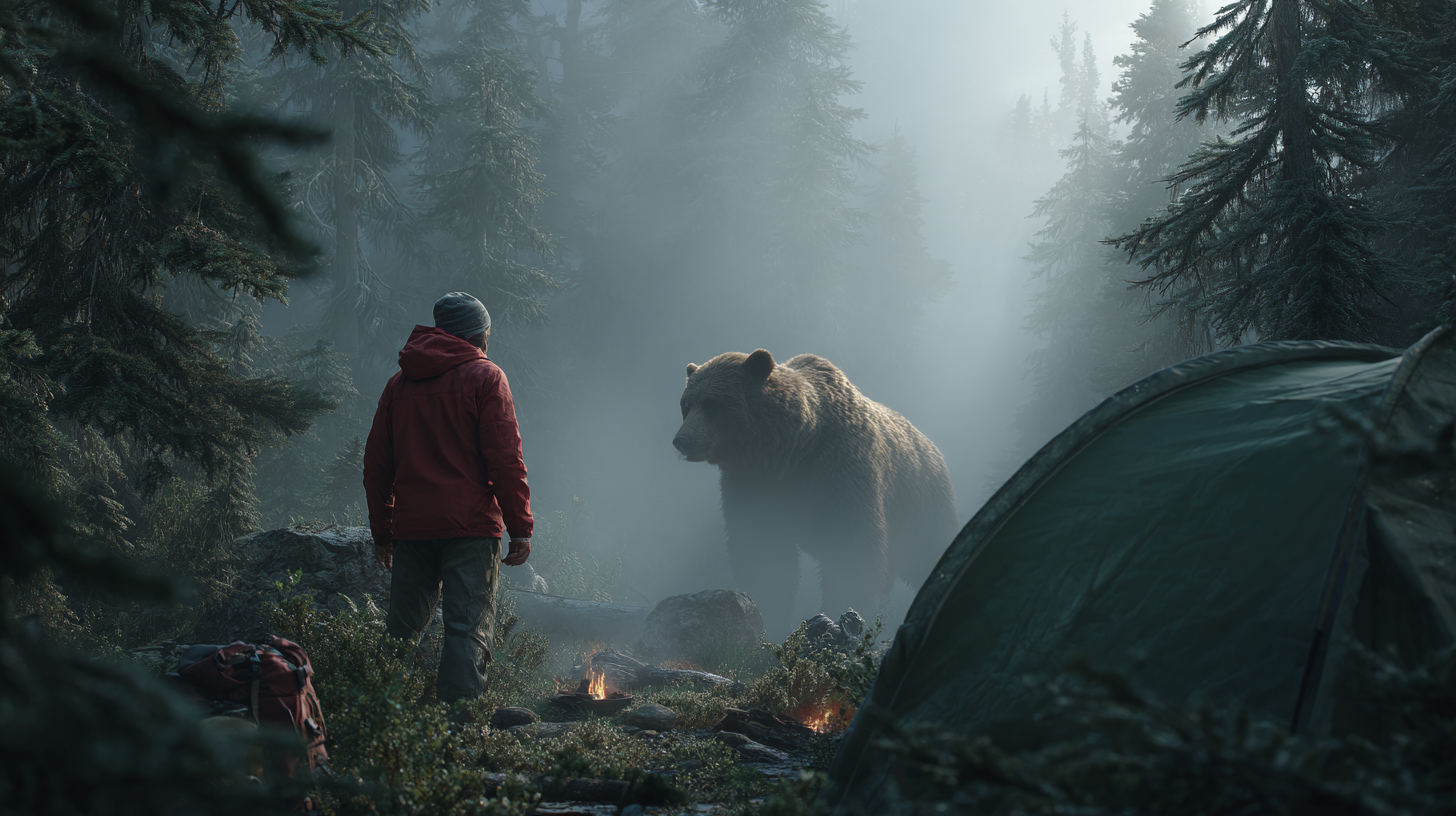 Ryan stood perfectly still. Every instinct screamed at him to run, but he knew that would be a mistake. The bear’s eyes glinted, dark and intelligent. It shifted its weight, sniffing the air between them. Ryan whispered, “Easy now.” His hand hovered near his backpack. The bear spray was inside, but he couldn’t reach it without drawing attention. The animal took one step closer, massive paws pressing silently into the wet soil. Ryan could see its breath drifting through the cold morning air. He tried not to blink. His body tensed, muscles locked, waiting for a reason to bolt. Then the bear tilted its head, almost curious, as if studying him.