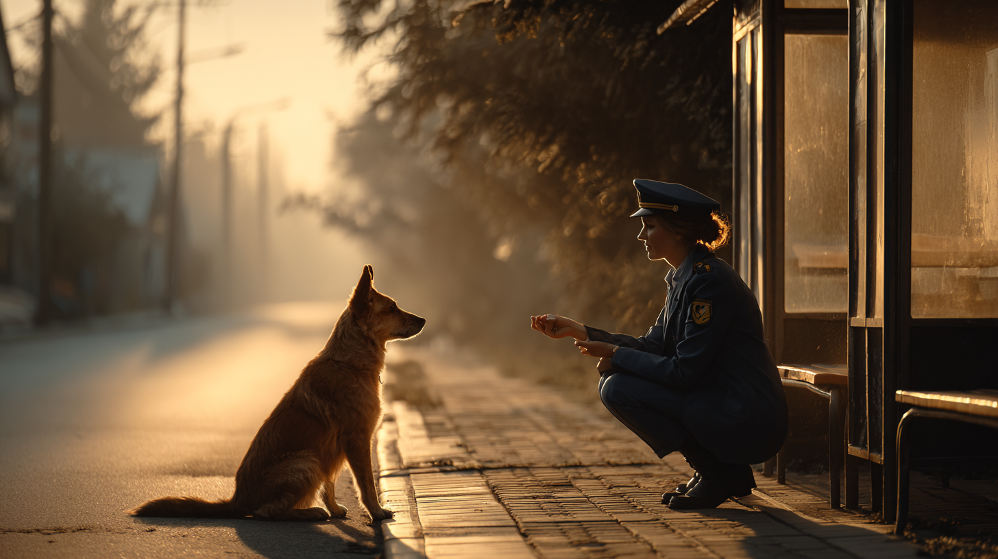 Laura placed the food and water down a few feet away and sat cross-legged on the sidewalk. “It’s okay, boy. You don’t have to be scared,” she said softly. Max sniffed the air but didn’t move closer. Instead, he watched her with quiet curiosity. For several days, Laura kept coming back, sitting near him, talking in a calm voice. She told him about her day, about the people she met on her route, even about the silly things passengers did. Slowly, Max began to inch closer a few steps one day, a few more the next. By the end of the week, something incredible happened. As she sat beside him, Max rested his head gently against her knee. Laura froze, hardly daring to breathe. Then she smiled, tears welling in her eyes. “There you go, buddy,” she whispered. “You’re not alone anymore.”