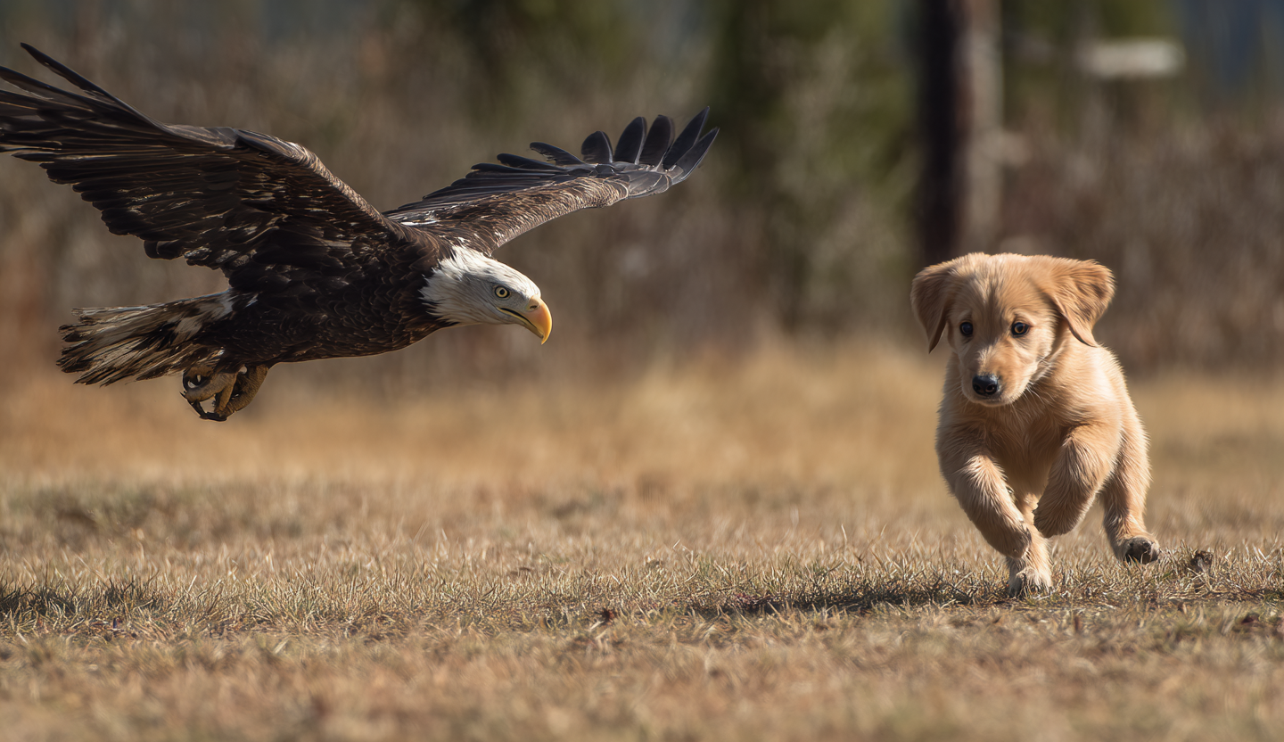 High above the houses, a massive eagle was circling the neighborhood, its golden feathers catching the sunlight. Then, without warning, it dove straight down talons first toward a quiet backyard. Before anyone could react, the eagle had snatched up a small puppy from the grass and soared back into the sky. For a few stunned seconds, no one could move. It felt like a scene from a wildlife documentary except it was happening right there, above their homes! Continue reading on the next page to find out what happened!
