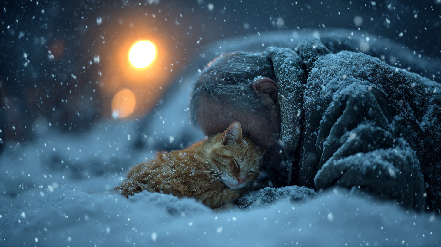 The cat circled him once, twice, then climbed onto his chest. It curled itself into a tight ball, pressing close to his coat. The storm howled around them, but the small creature didn’t leave. Each breath from the cat sent faint warmth into the frozen layers of fabric. Beneath it, the man’s heartbeat slowed but didn’t stop. Hours passed. The cat stayed. By dawn, the blizzard had quieted. A lone snowplow rumbled down the road, its driver bleary-eyed from a long night. Something caught his attention a strange shape in the ditch. He slowed, squinted, and blinked in disbelief. There, half-buried in snow, lay an old man. On his chest, a small orange cat stared back at him, unflinching.